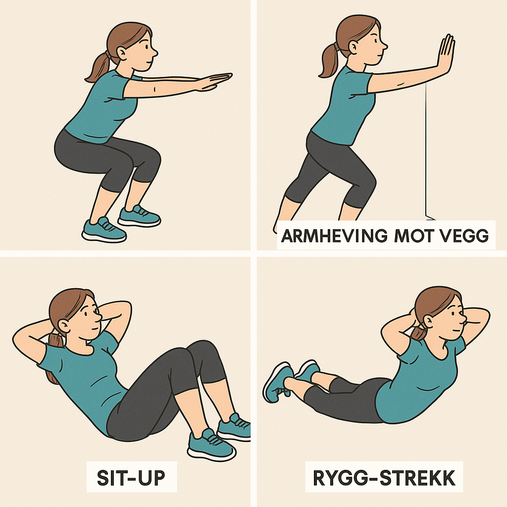Hver øvelse kan gjøres på ulike måter, med og uten belastning som strikk, knebøy kan utvides til spensthopp osv, evt ulike måter å holde armene på. Er du i tvil, er det lurt å kontakte fagperson som kan hjelpe deg med et lite treningsopplegg (illustrasjoner fra Chat GPT hvor jeg la inn spørreord: situp, knebøy, armhev mot vegg og ryggstrekk, lag en tegnefigur)
